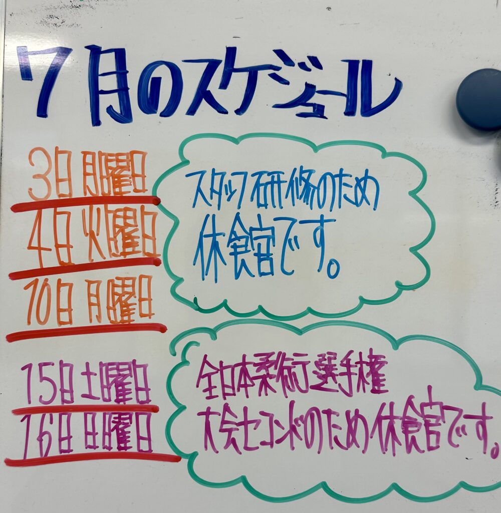 2023年7月のスケジュール変更。 2023年7月のスケジュール変更です。3日(月)、4日(火)、10日(月)はスタッフ研修の為、休館日。15日(土)、16日(日)は全日本柔術選手権のセコンドの為、休館日。グラバカ会員の皆様宜しくお願い致します。 2023/06/21