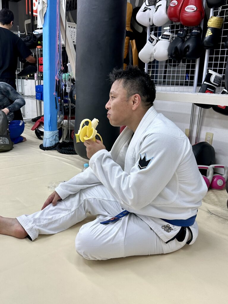 御呉利羅様の降臨を喜びバナナを頬張る吉川組長。