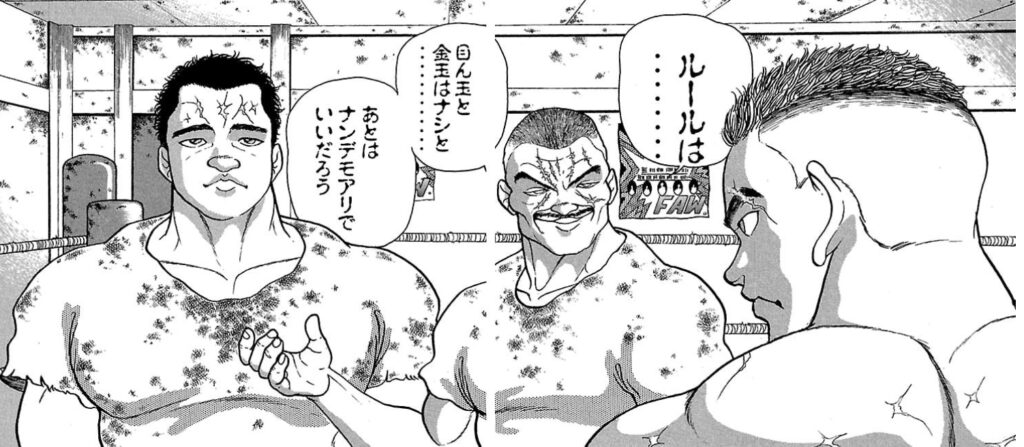 目ん玉と金玉以外はほぼなんでもありの果たし合い。アル中吉田先輩同様、技の精度は低くても気合と魂でアニキが福良さんに勝っていました。福良さん、、空手精神はどこへやら、、顎が痛くてタップしてました。