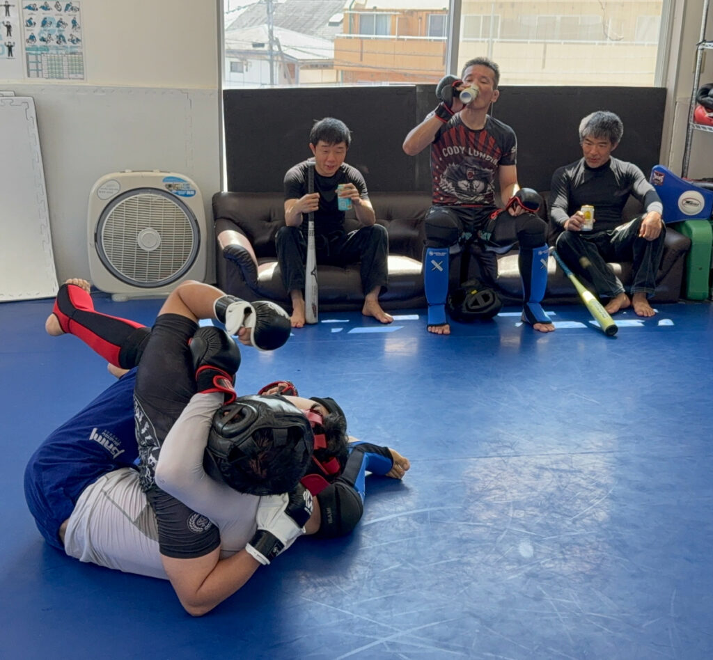 そんな、東村山ジムですが、「空手家」、、という不穏分子がいるようです。体験の方が帰ったのをみて、酒乱のアニキと福良さんがおっぱじめました。