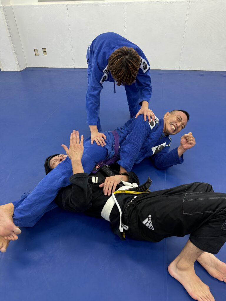 柔術クラスでは、クローズドガードからのKガード、そこからの三角絞めとフットロックの練習をしました。