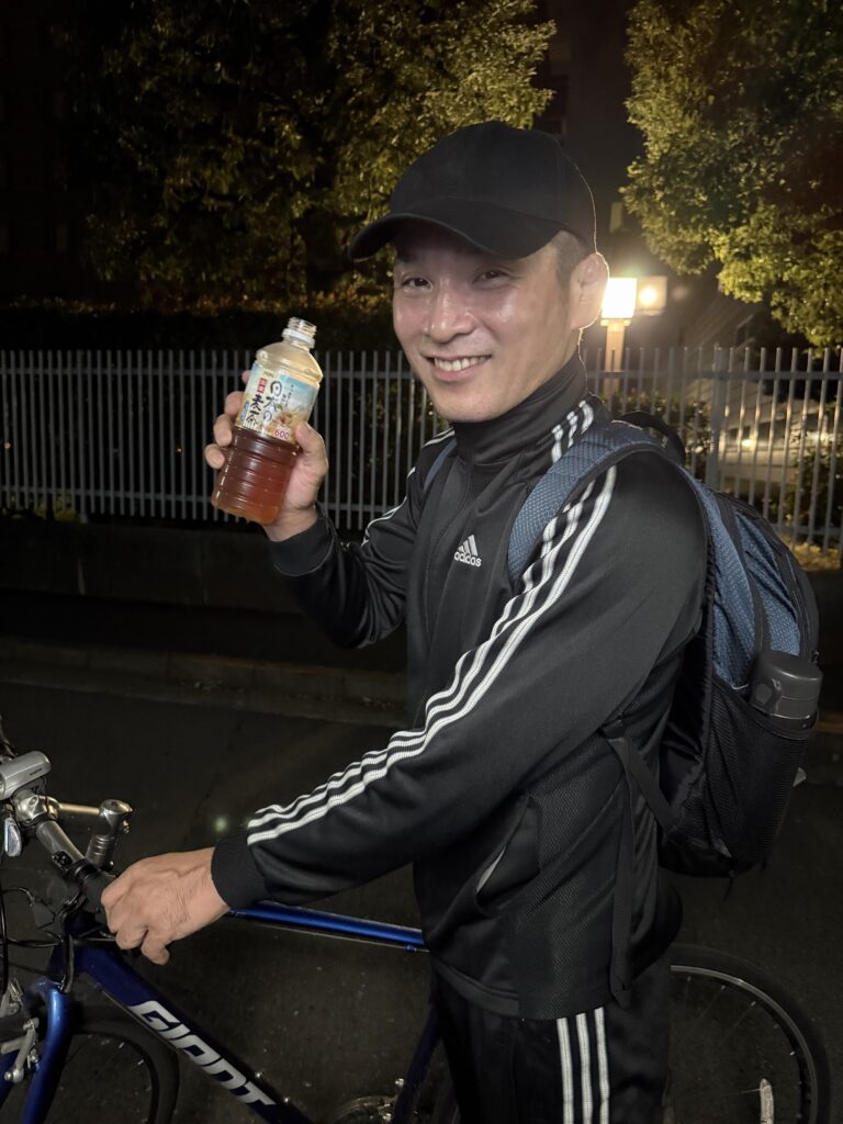 強か酔っぱらってしまい、横山先生とともに自転車を漕がず押して帰る道すがら、麦茶まで奢っていただきこの笑顔……。 片岡義隆