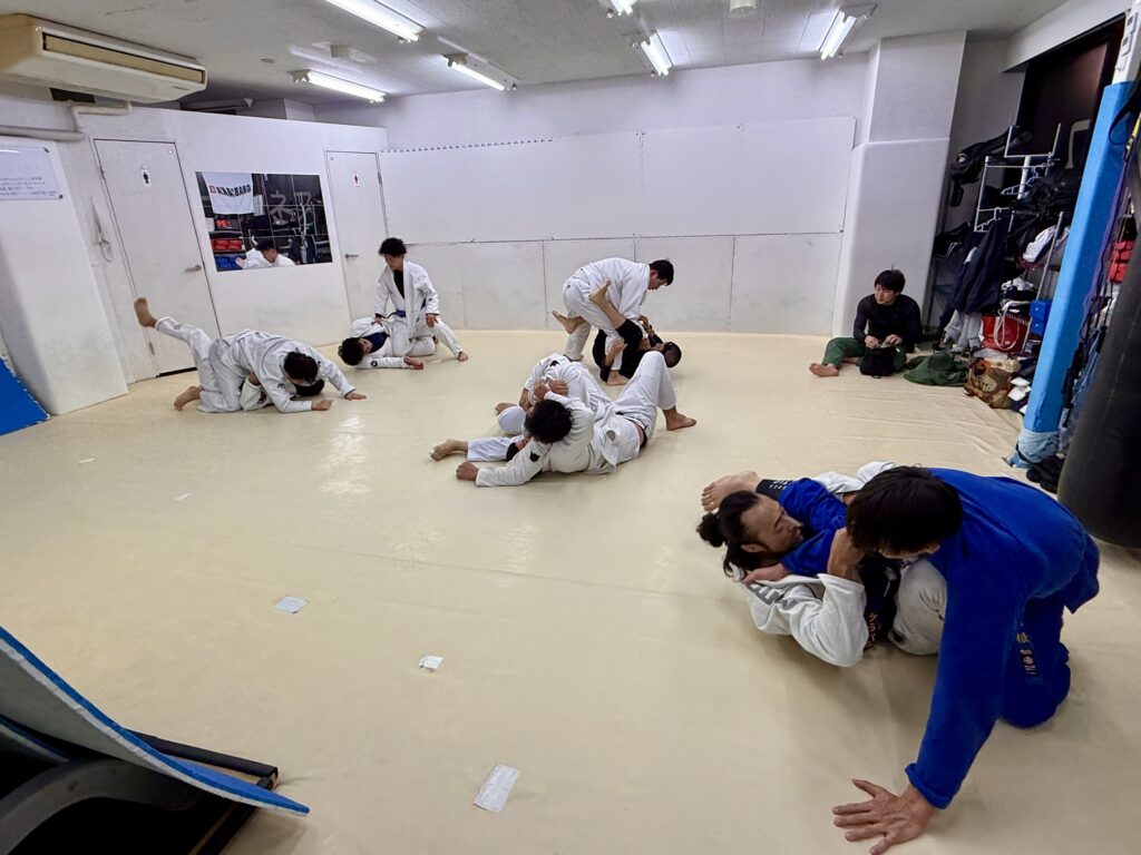 柔術1クラス目は、シッティングガードしてくる相手に襟を持たれた時のパスガードの動きを。さらに、そこから腕十字を極める練習。