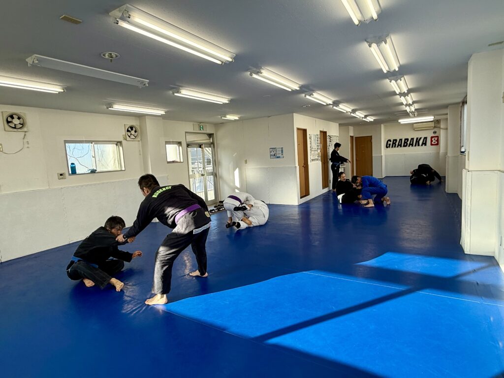1クラス目は、クローズドガードを立って割って、ハーフにさせずサイドをとるまでの流れを、「立ち方」、「割り方」、「ハーフに組まれずにサイドへ移行する方法」、「相手の帯が緩い場合」のパターンに分解して、練習。