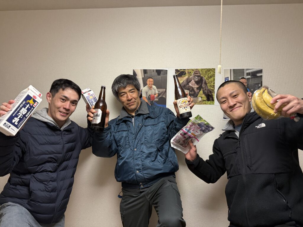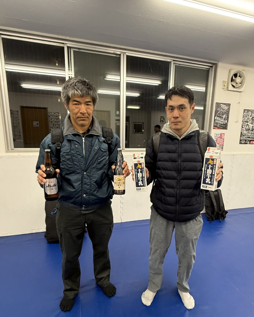 何故かジムに瓶ビールと牛乳を持って現れた黒岡さんと千葉さん。