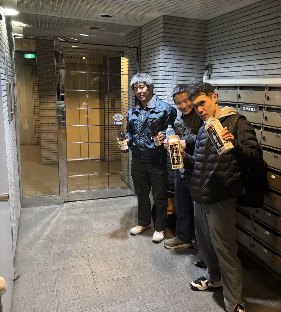 練習後、家主の谷沢君よりも先に谷沢ROOMのエントランスに来て待っていた3人組。
