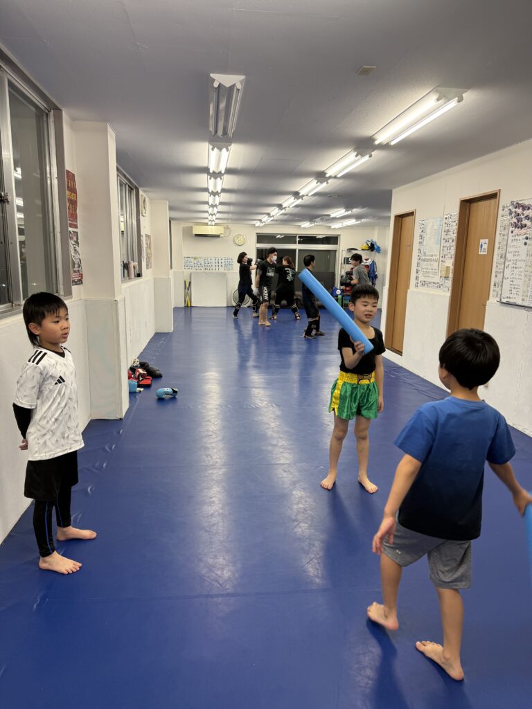 キックボクシングクラスのスパーリング、下級生はチャンバラ。