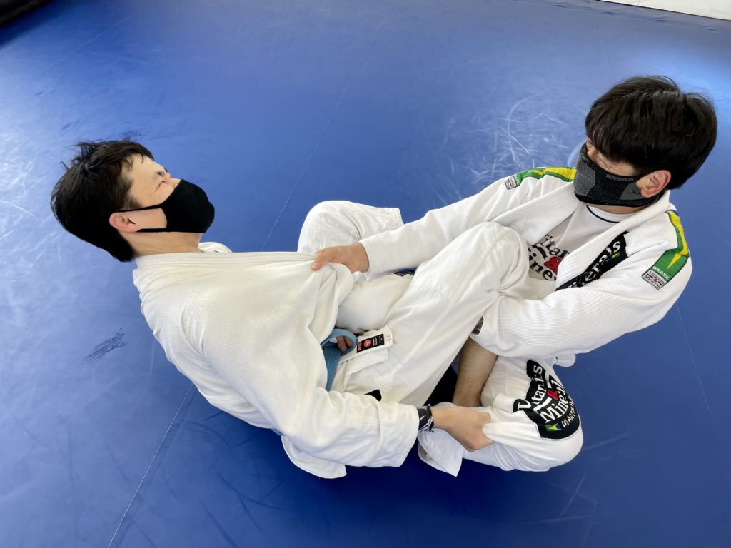 浩ちゃんはシングルレッグエックスガードからストレートフットロックを狙い、木村先生はカウンターの膝固めを狙っています。