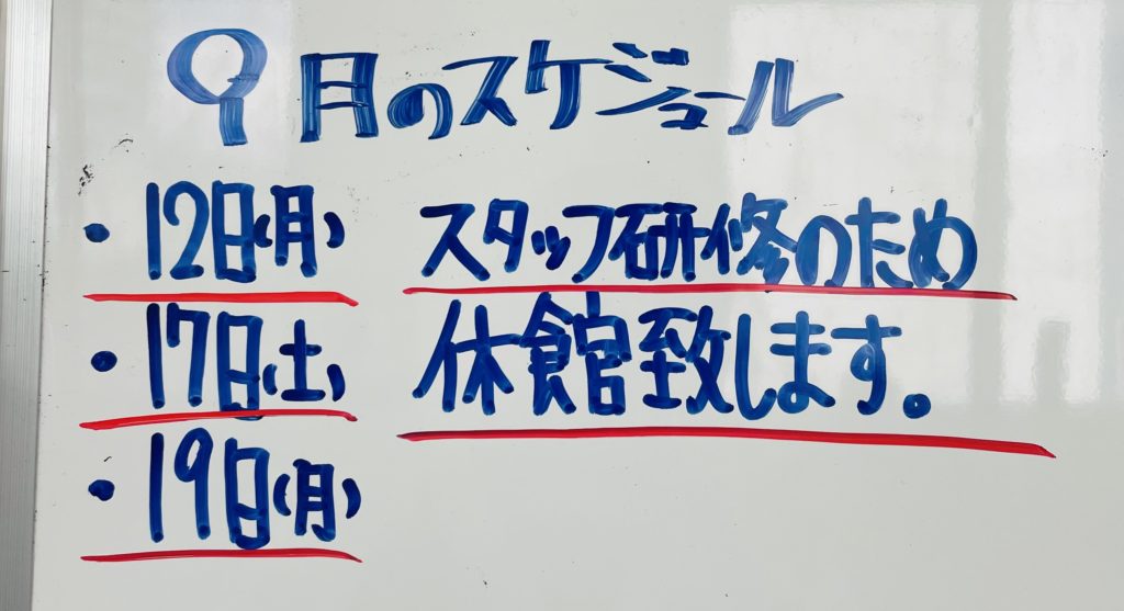 9月のスケジュール変更は12日(月)、17日(土)、19日(月)が休館日です。